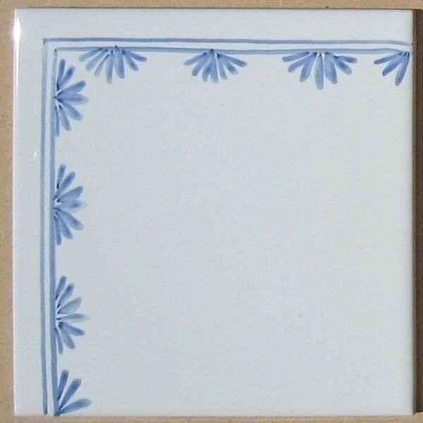 Denne dekoration er tiltænkt et hjørne i en flisebort. Placeres de dekorerede fliser i et bånd på tværs af badeværelset eller køkkenvæggen, kan du med enkle midler tilføre væggen et smukt og personligt præg til en meget rimelig pris, da alle de øvrige fliser blot er hvide.