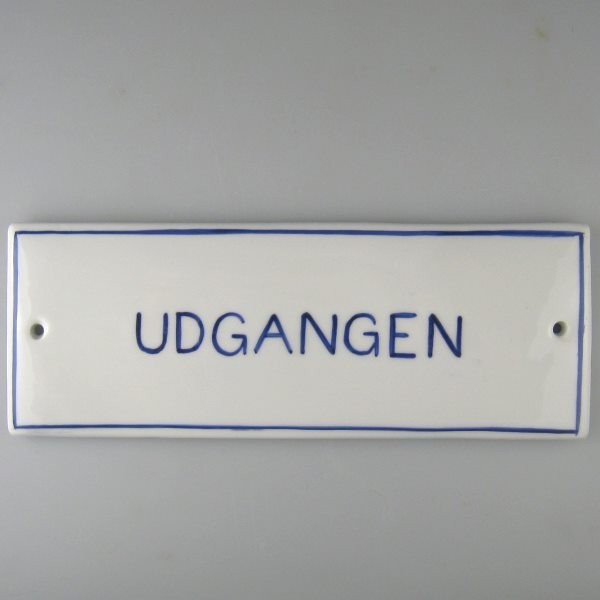Dette skilt i håndmalet porcelæn måler 21 x 8 cm. Teksten er skrevet med blokbogstaver, desuden er der malet en streg langs kanten. Dekorationen samt tal/bogstaver males i farverne blå, sort, bordeauxrød og i grønt.