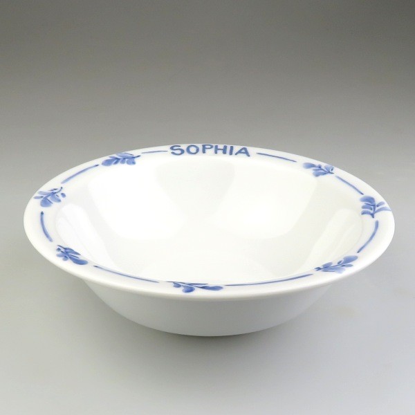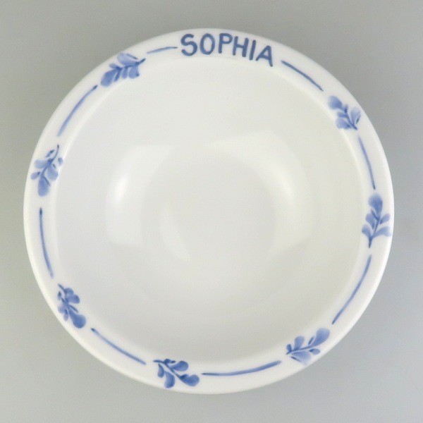 Morgenmadsskål / ymerskål med navn og bladdekoration i håndmalet porcelæn