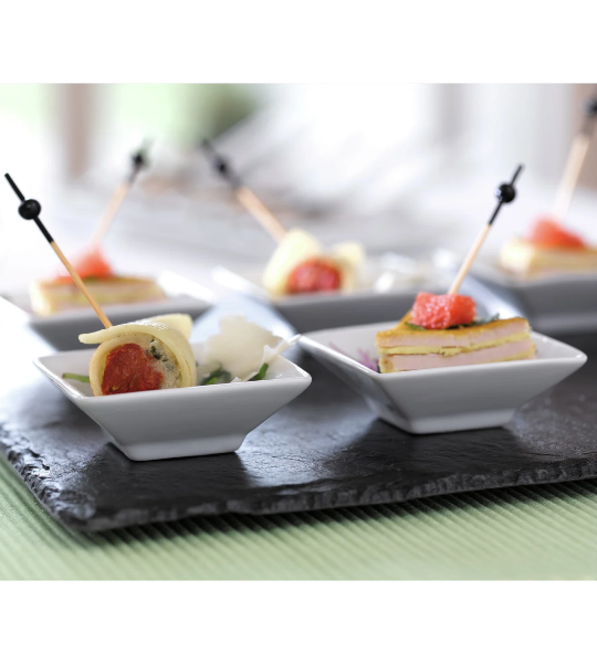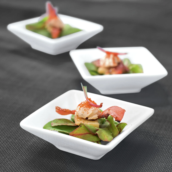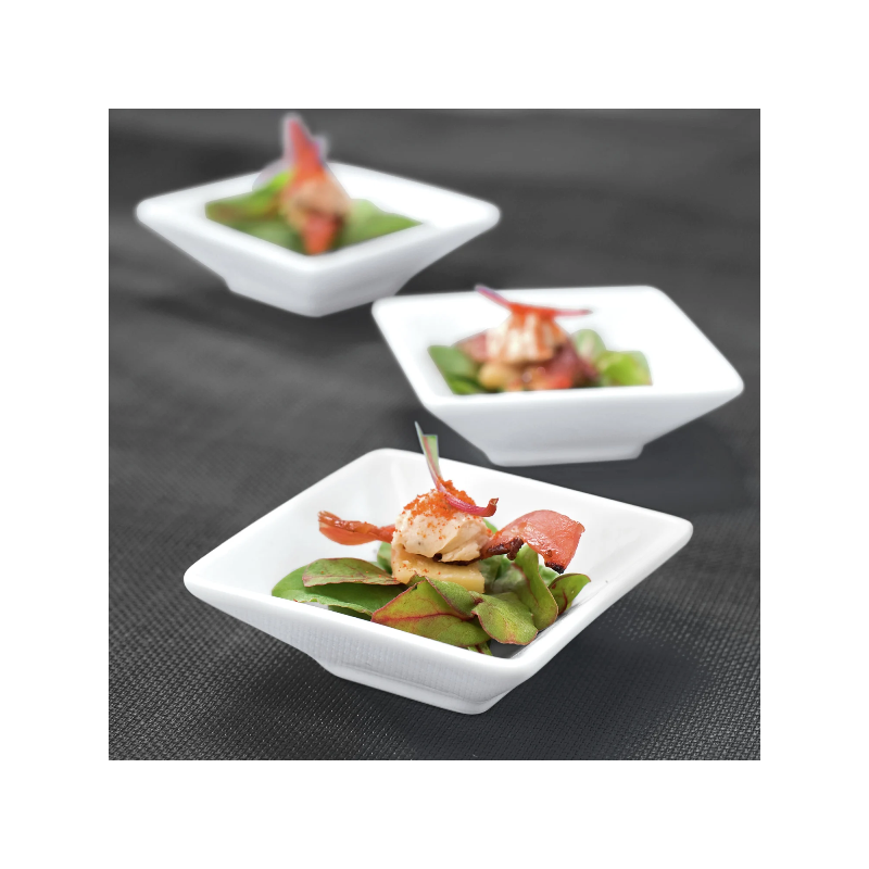 Denne kvadratiske skål er velegnet til at servere små retter og delikatesser eller smagsprøver.