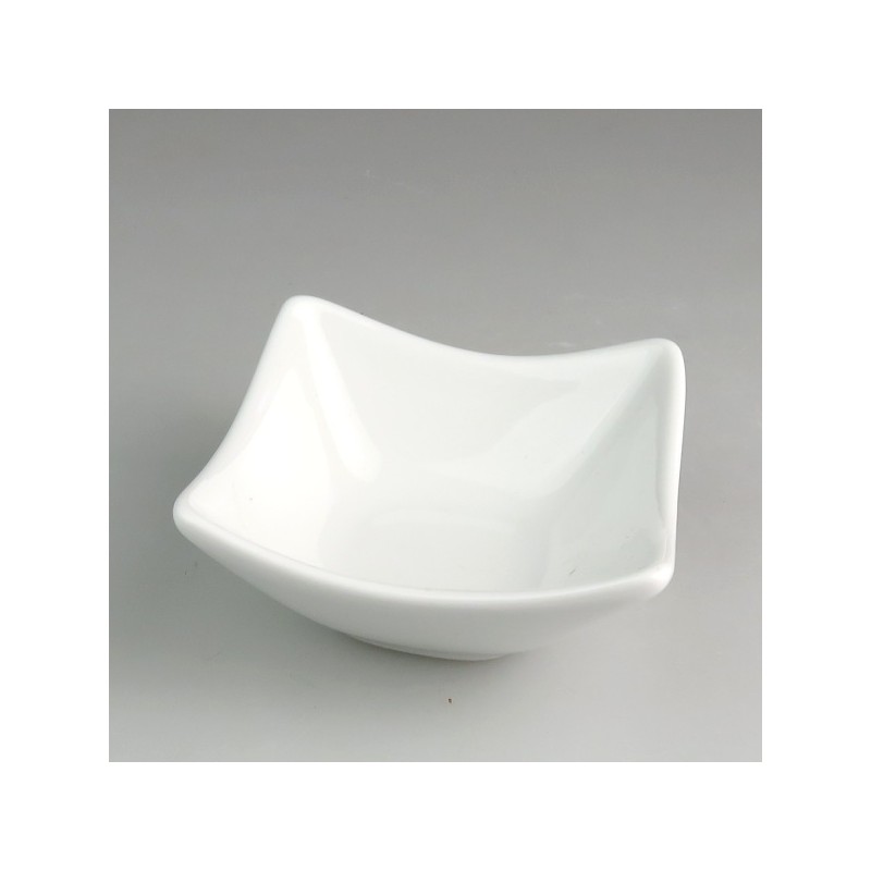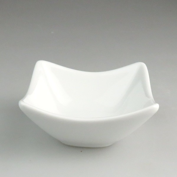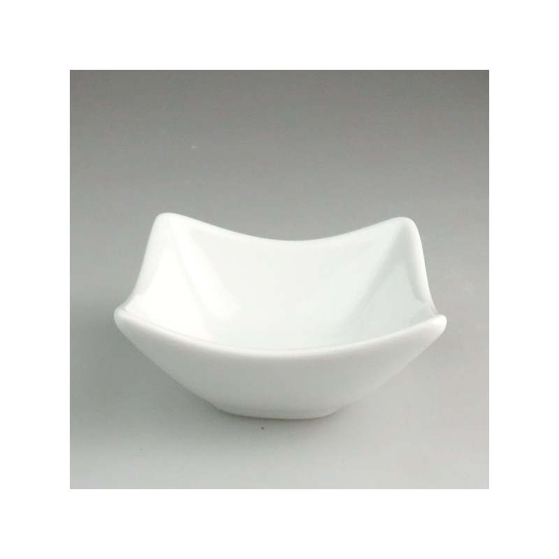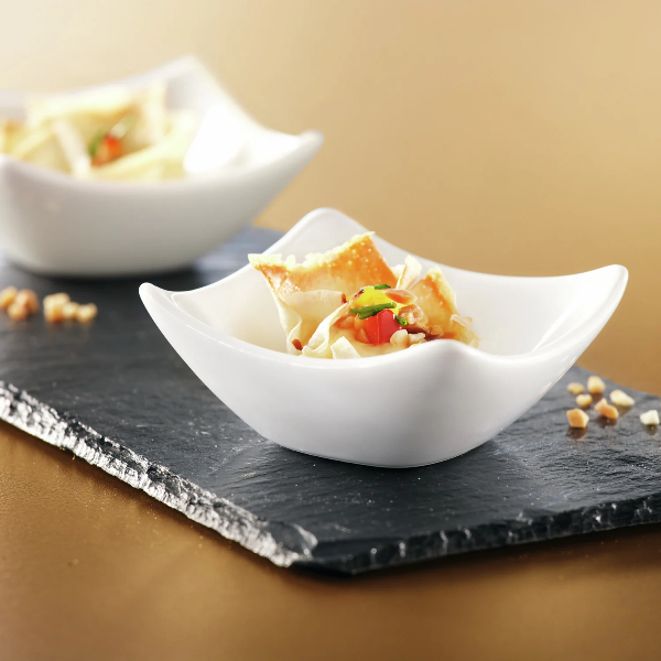 Denne kvadratiske skål med de bløde former er velegnet til at servere små retter og delikatesser eller smagsprøver.